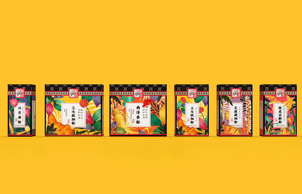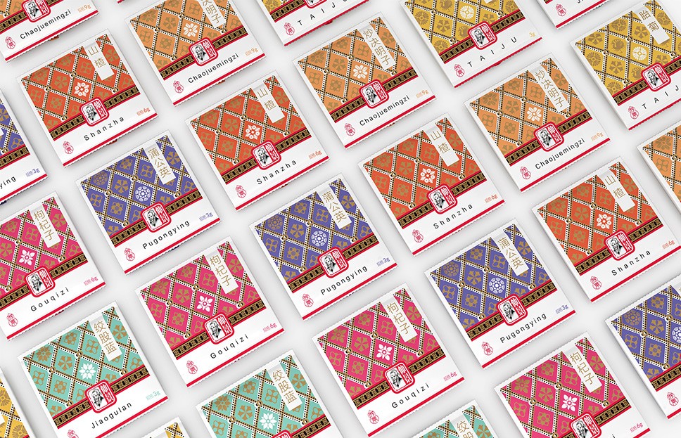李華清項目團隊在市場走訪中看到了中醫抓方配伍的場景,由此產生了靈感的聯想。我們運用方勝紋與十字穿環紋結合衍生出抓方配伍場景凌霄花、茱萸花、柿蒂紋與產品進行搭配,實現君臣佐使,和諧配伍。通過簡單有序的元素排列,形成專屬的仲景花茶戰略元素。