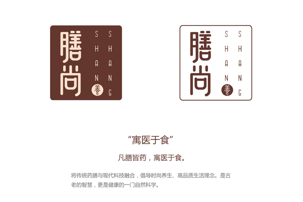 膳尚的標志吸取了傳統印章的特點,進行簡化,方中有圓,渾然天成,將安全可靠的老字號概念帶給人全新的時尚現代的氣息。字體設計圓潤有富自然氣息,傳遞出品牌滋養身心、健康生態的屬性特點,打破傳統排列方式,使得品牌更加具有獨特個性。