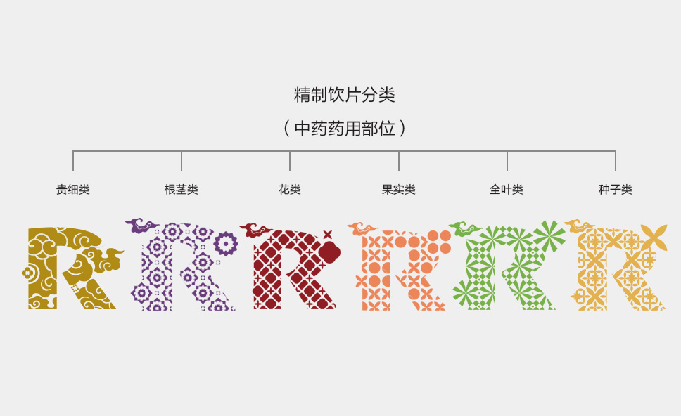 以“R”作為精制飲片核心戰略元素,結合代表中國文化符號的祥云,傳遞品牌追求身心和諧、人際和諧、天人和諧的思想,傳播文化和仁愛的理念。