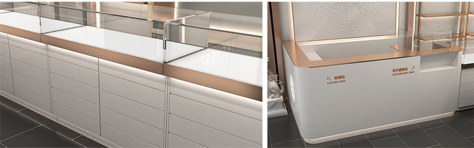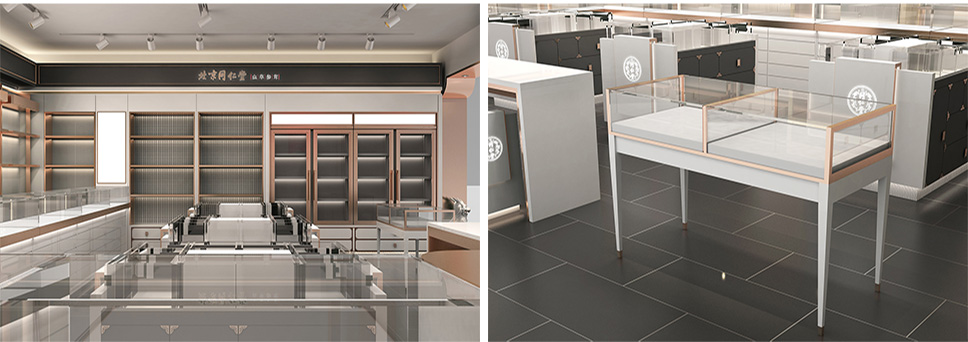 采用深灰、白和玫瑰金色搭配,使整體店面既有富麗堂皇之氣場,也有清新脫俗之雅韻。一方面與同仁堂傳統(tǒng)店面形象區(qū)分開來,另一方面在傳承同仁堂文化的同時(shí)也對同仁堂形象進(jìn)行了升華,使其店面更具視覺特點(diǎn)和識(shí)別性;更加現(xiàn)代時(shí)尚,符合未來人群的審美情趣。