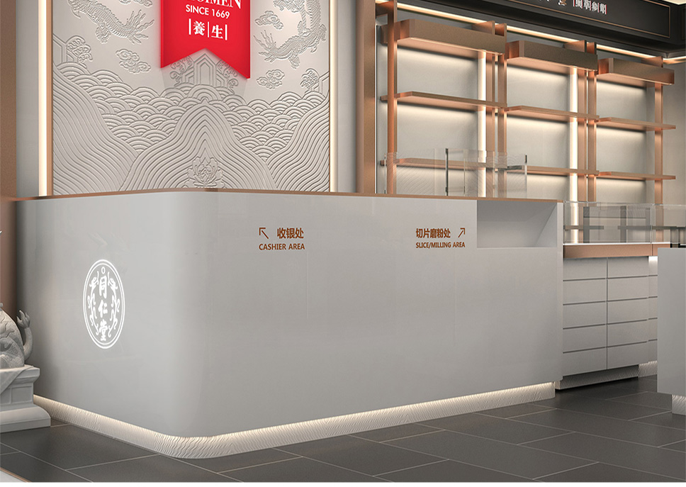 強(qiáng)化燈光、色彩、材質(zhì)之間的效果互補(bǔ),創(chuàng)新工藝組合,區(qū)隔了傳統(tǒng)藥店陳舊思維,新穎獨(dú)特,體現(xiàn)了同仁堂的品質(zhì)。